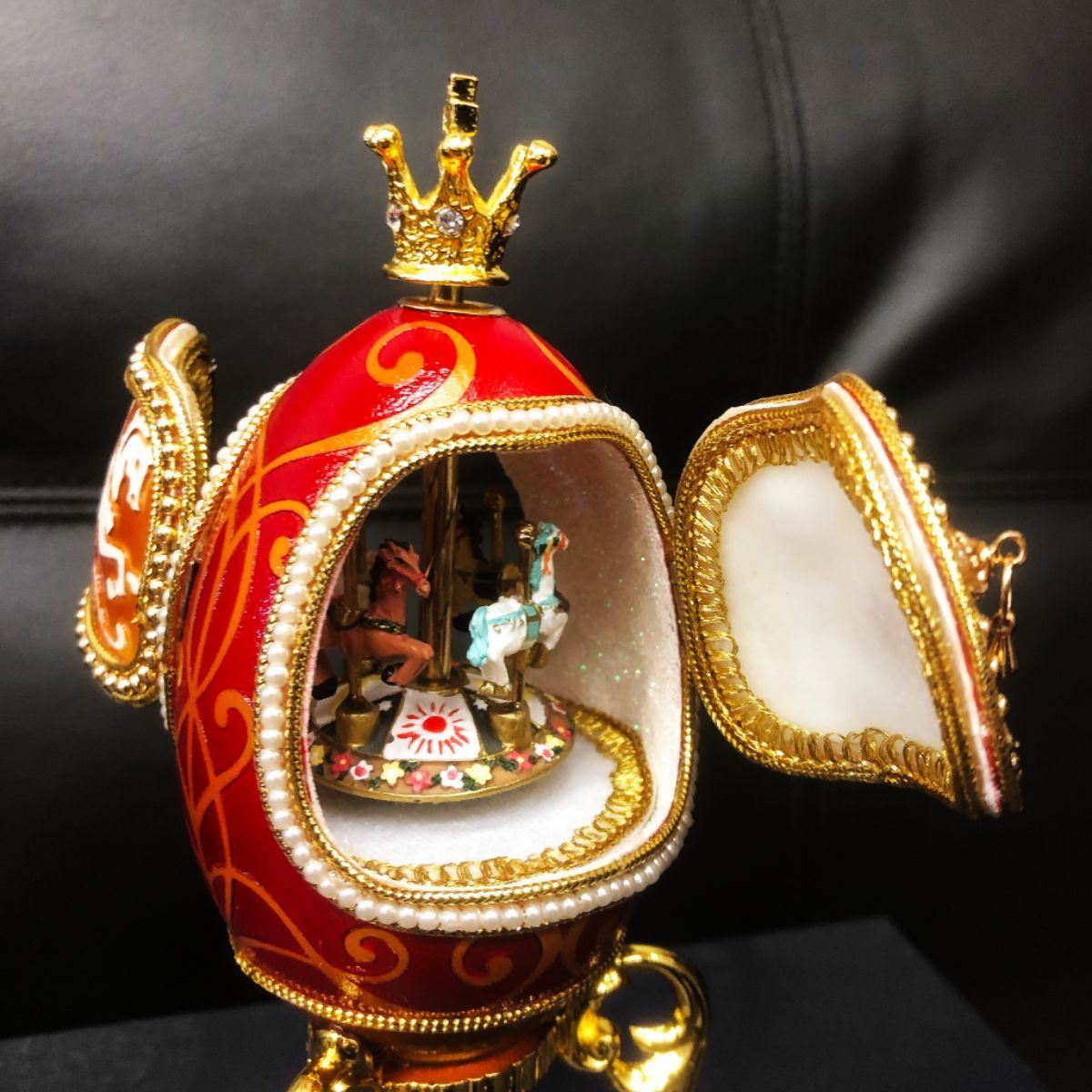 A Merry Go Round Faberge Egg In Navy Box. This Display Piece Winds Up And the Merry Go Round Rotates To The Music. Doctorate Front and Rear Door That Opens To Display The Revolving Horses Inside.