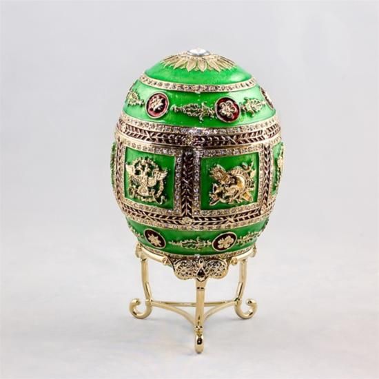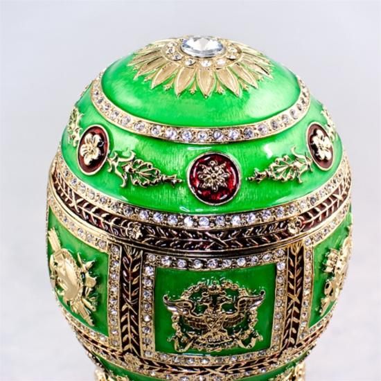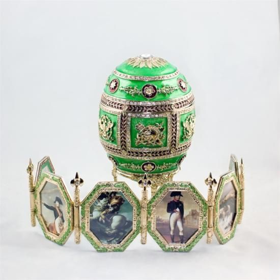 Faberge Napoleonic Egg. Material: Pewter, Enamel, Crystals. Dimensions: 6.5in (H) X 3.5in (D) The famed Faberge eggs are jeweled eggs, often with the most ornate, minuscule designs on them. The House of Faberge made the original pieces from 1885 to 1917. At that time, they became popular gifts given during the Easter season. Larger versions were made for the Russian royal family, including Alexander III and Nicolas II. Of these, 42 of the 50 originals exist today.