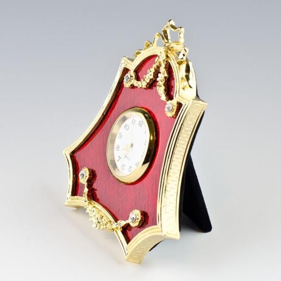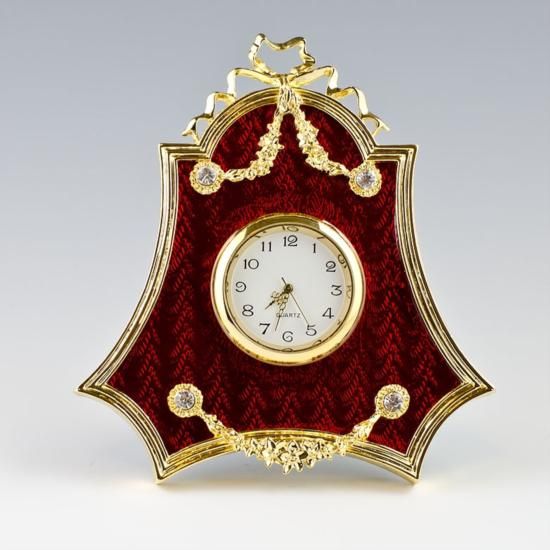 Faberge Red Enameled Clock Frame, The photo frame is in two color gold-mounted green enamel surrounded by a crystal set ribbon tie suspended by a laurel garland. The frames edges are covered with golden chased laurel border. Dimensions: 4in (H), Material: Pewter, Enamel, Crystals, Quartz Clock.