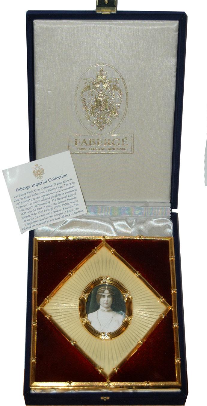 Original Faberge red, yellow and gold frame from their Imperial Collection. 24K gold-plated frame stands 8'' high and 7'' wide, and fits a photograph measuring approximately 2.75'' x 1.75''. With Austrian crystals in the display area around frame. Marked ''Faberge'' on the reverse. Comes with original presentation box, perfect for gift or display. Fine condition.