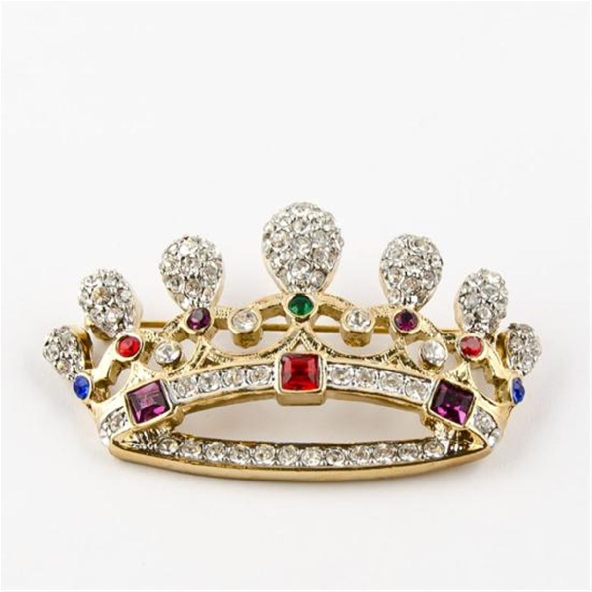 Faberge Style Crown Brooch, Dimensions: 2.25in (W) x 1.5in (L), Material: Pewter, Crystals. The brooch is an absolute sparkling beauty with colored crystals all over.