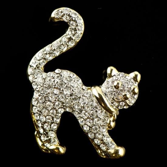 Faberge Style Crystal Cat Brooch, Dimensions: 1.25 in (W), Material: Pewter, Crystals. The brooch is an absolute sparkling beauty with colored crystals all over.