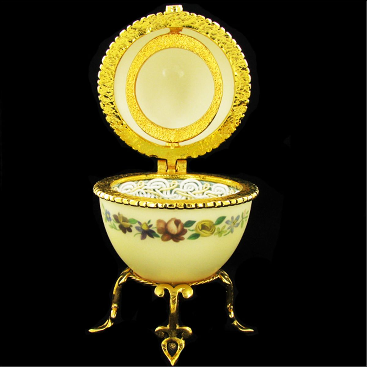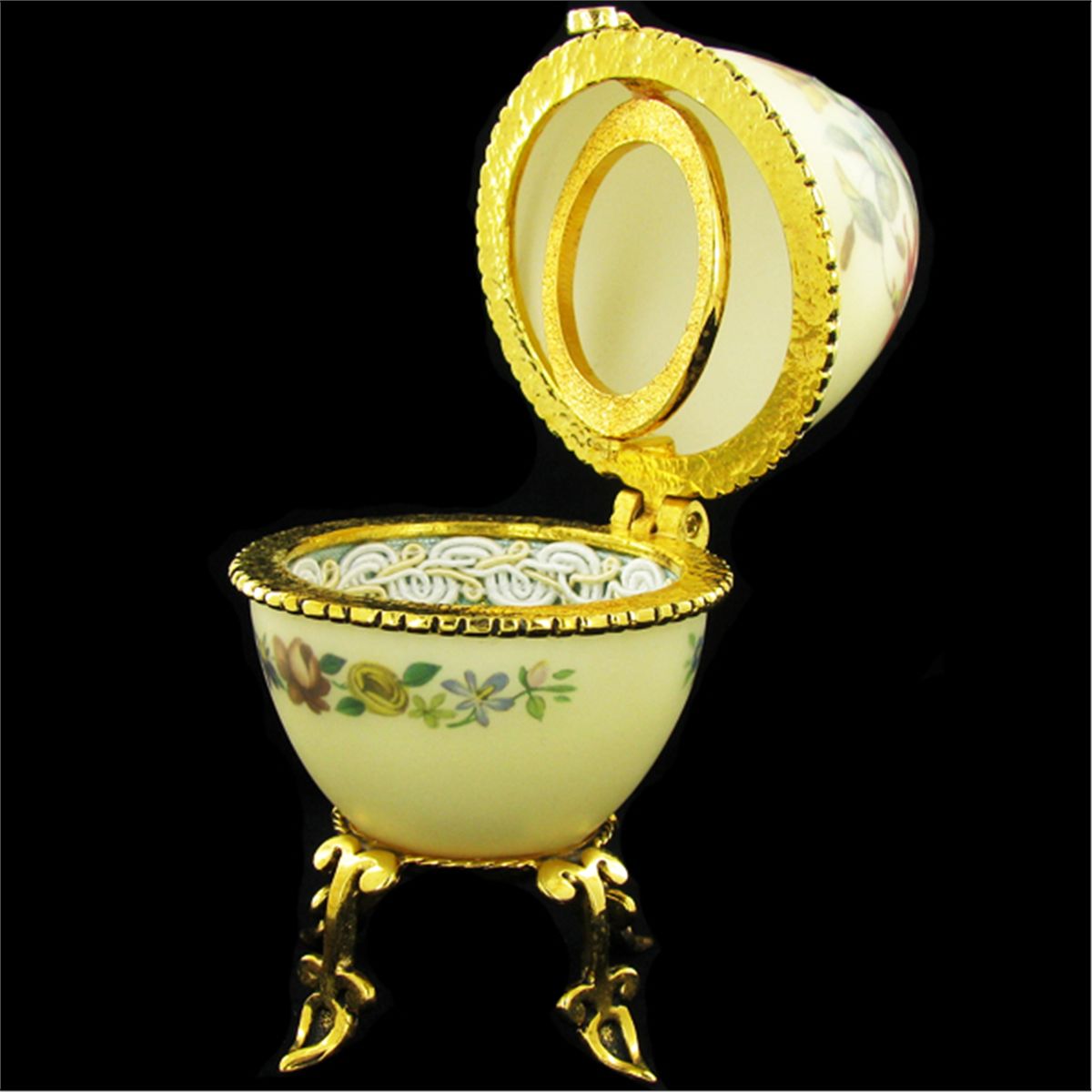 Ornately hand-decorated, 18k gold over pewter hardware, silk lined, 4";