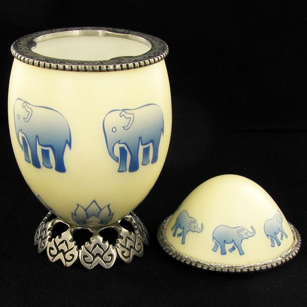 Ornately hand-decorated, pewter hardware, silk lined, 4";