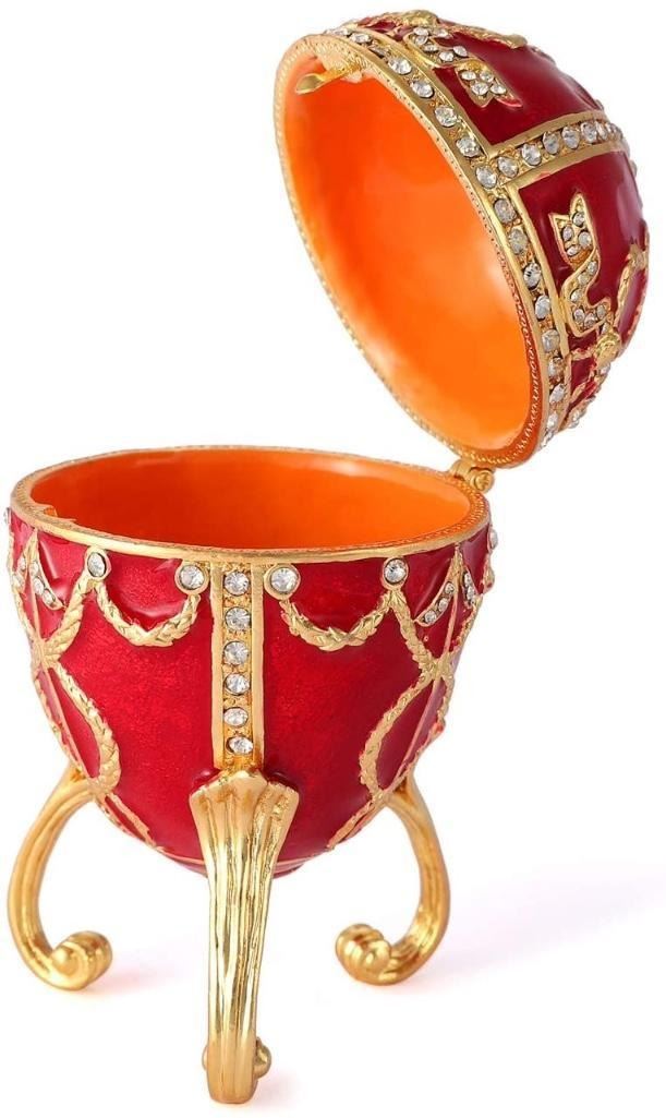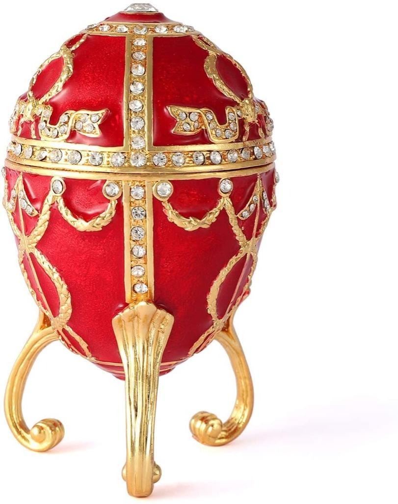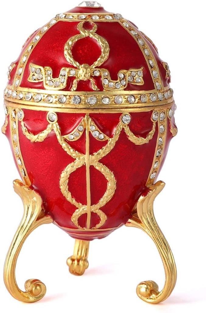 Created in the style of the jeweled eggs of Carl Faberge for the Russian Royal family. Enamel & gilt over pewter, with embedded Austrian crystals, scrolled, tri-footed trinket, jewel box egg. The egg opens at center, on a hinge with snap closure, to reveal an enameled interior to storing trinkets or jewels. Adorned with a larger 6mm Austrian crystal on top. Â 3 1/2" H X 2" L X 2" W.Â