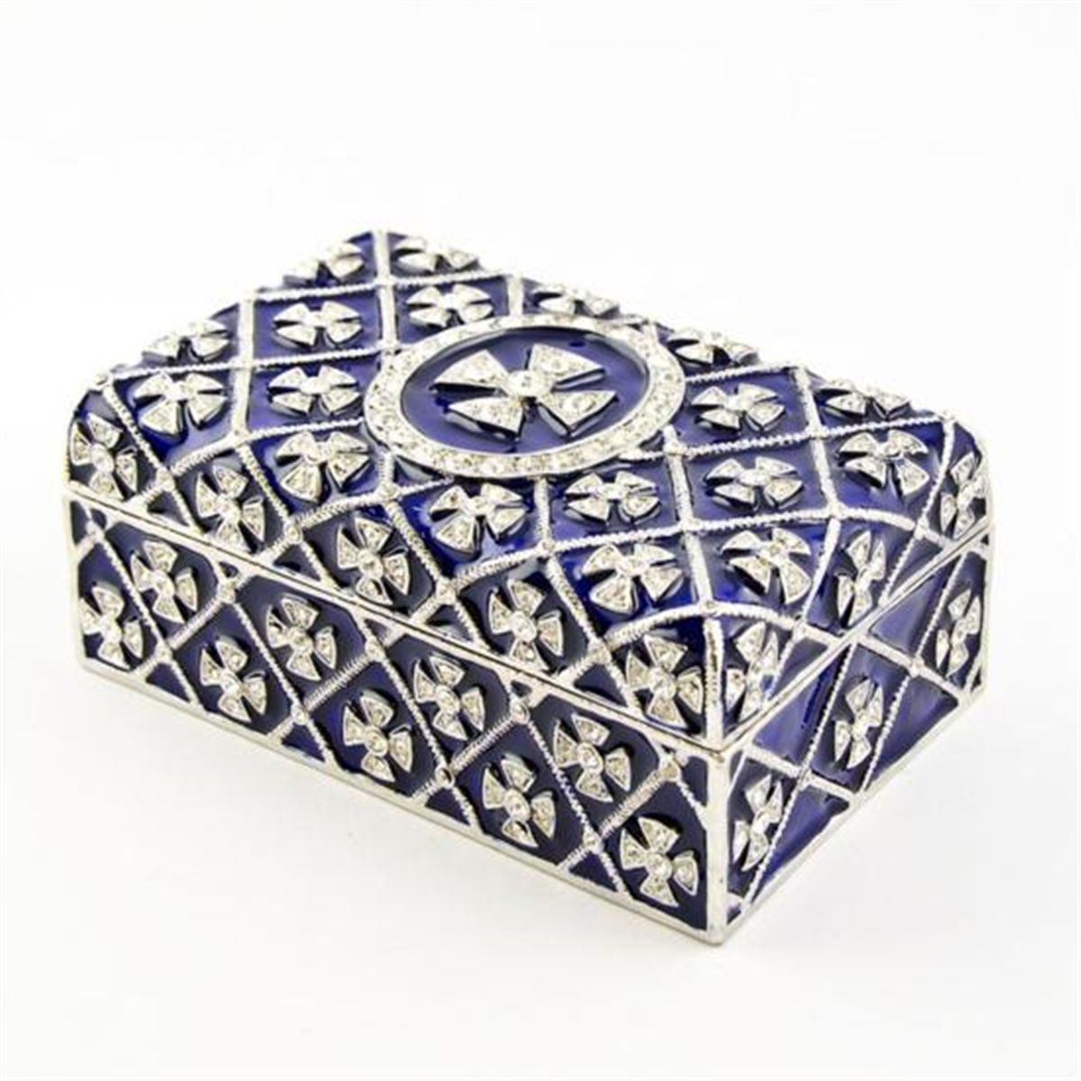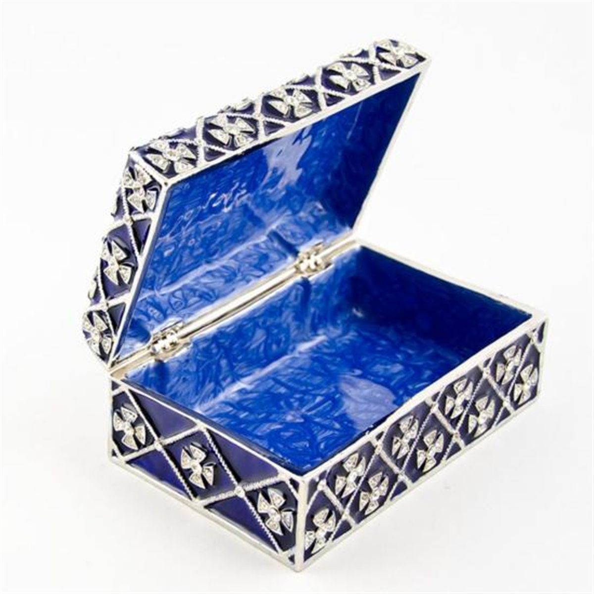 Faberge Trinket Jewelry Box. This jewelry box has blue translucent enamel under the crystal ornamentations in the form of crosses. Faberge?s superb enameling technique is regarded as one of his main contributions to art at the end of the last century. These wave (moire) designs are a common type of guilloche work on enameled articles by Faberge. The inside of the box is covered with blue enamel. Material: Pewter, Crystals, Enamel. Dimensions: 3.75in (L) X 2.25in (W) 1.5in (H) The famed Faberge eggs are jeweled eggs, often with the most ornate, minuscule designs on them. The House of Faberge made the original pieces from 1885 to 1917. At that time, they became popular gifts given during the Easter season. Larger versions were made for the Russian royal family, including Alexander III and Nicolas II. Of these, 42 of the 50 originals exist today. Most Faberge eggs, though, were much smaller and hung from a chain around the neck. These eggs have precious metals on them or gemstone decorations, often with intricate detailing. These are a symbol of luxury and thought of as individual masterpieces.