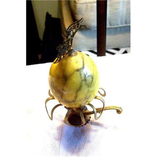 Yellow marbled onyx egg is permanently fixed to elaborate gilt metal stand. Gilt butterfly is fixed to top of egg.