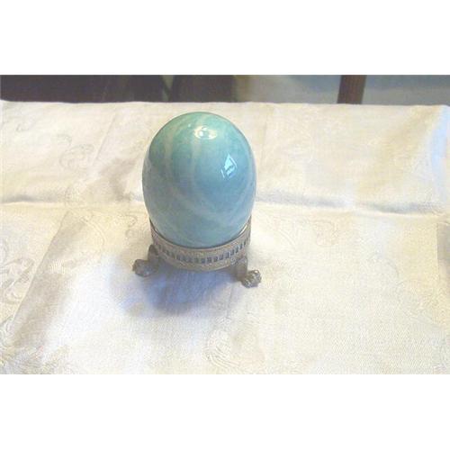 Beautiful robin's egg blue marbled onyx egg on elaborate gilt metal stand. Stand has pierced gallery and 3 lion's paw feet, 1.5" D.