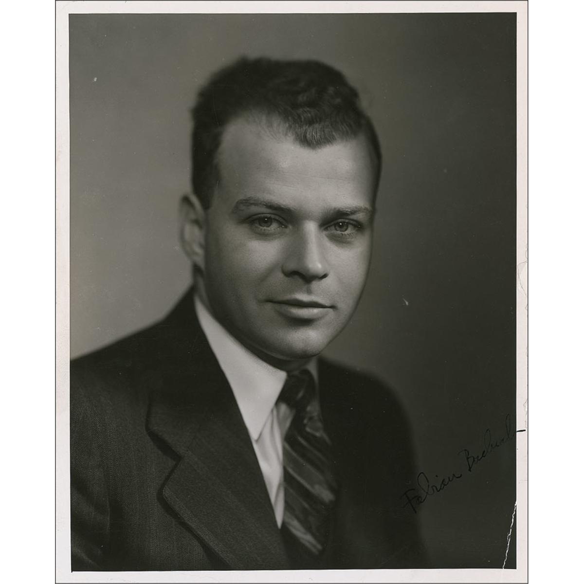 Third-generation portrait photographer (1917–2010) best remembered for his portrait of John F. Kennedy. Glossy 8 x 10 head-and-shoulders portrait, signed in fountain pen, “Fabian Bachrach.” Heavy crease to bottom right corner, a horizontal crease near the bottom, emulsion crazing, a slight paperclip impression at the top edge, and moderate signature contrast against the darker background, otherwise fine condition.