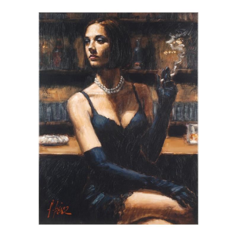 "Study Brunette At Bar" is a hand textured limited edition giclee on canvas board by Fabian Perez. The piece is numbered and hand signed. Includes a certificate of authenticity. Measures approximately 16.5" x 12"