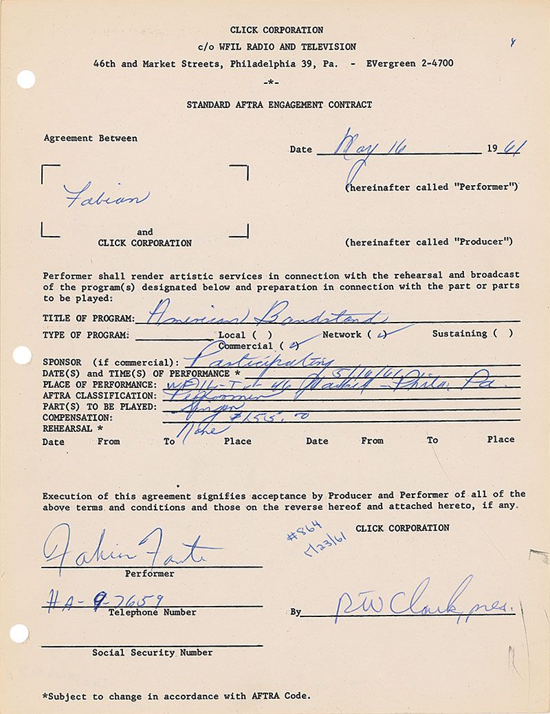 DS, signed “Fabian Forte,” one page, 8.5 x 11, May 16, 1961. Standard AFTRA agreement between Fabian and Click Corporation to appear on American Bandstand. In fine condition, with expected filing holes to left border.