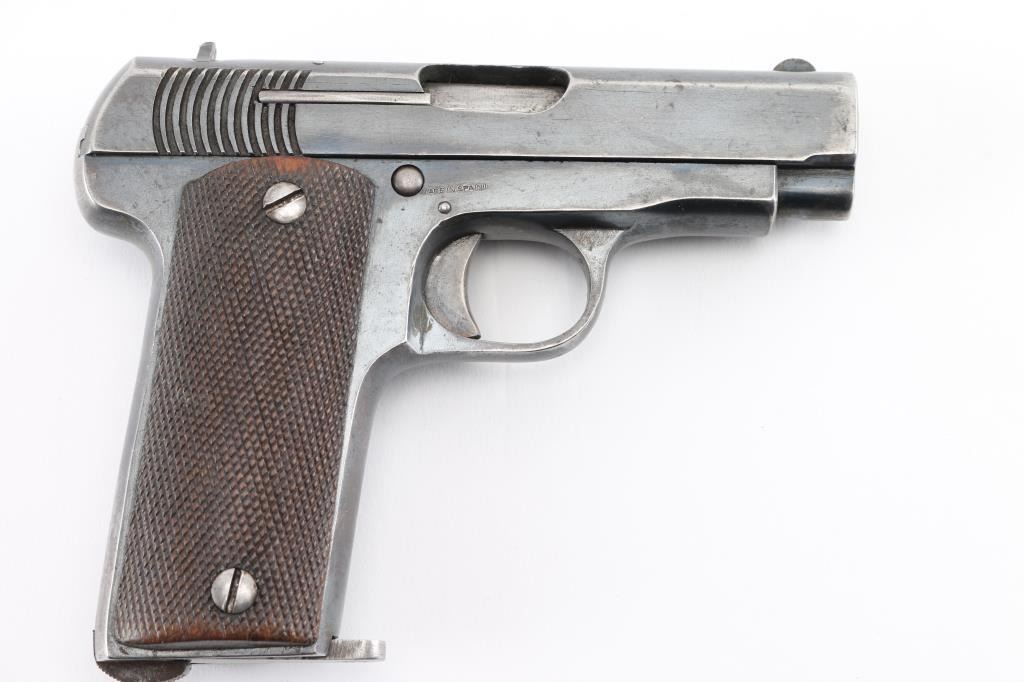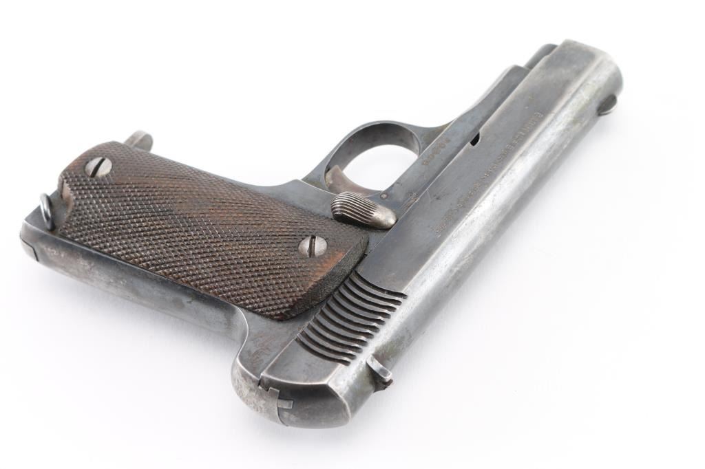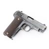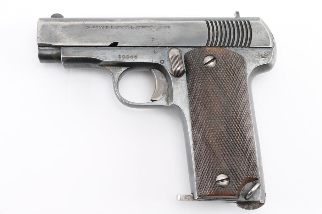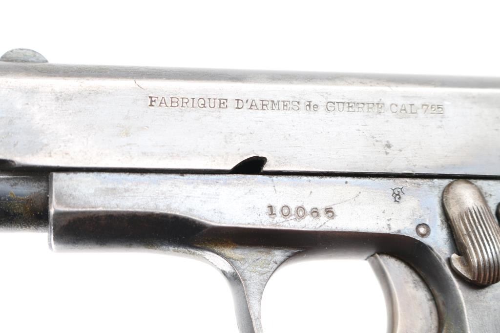 Sn: 10065 Spanish made Ruby pattern semi-automatic pistol. No importer markings observed. Features a blued finish, 3.5" barrel, low-profile round blade front sight, dovetailed rear sight, smooth trigger, concealed hammer, manual safety, heel magazine release, steel magazine marked "IS", "IS" marked steel frame with lanyard loop, two-piece fully checkered wood stocks. Bore is good condition with dark grooves. Pistol exhibits approximately 65% of it's original finish showing fading. edge wear, handling marks, very little patina. Grips are good condition with losses to checkering points. Condition is NRA Very Good *** C&R firearm ***