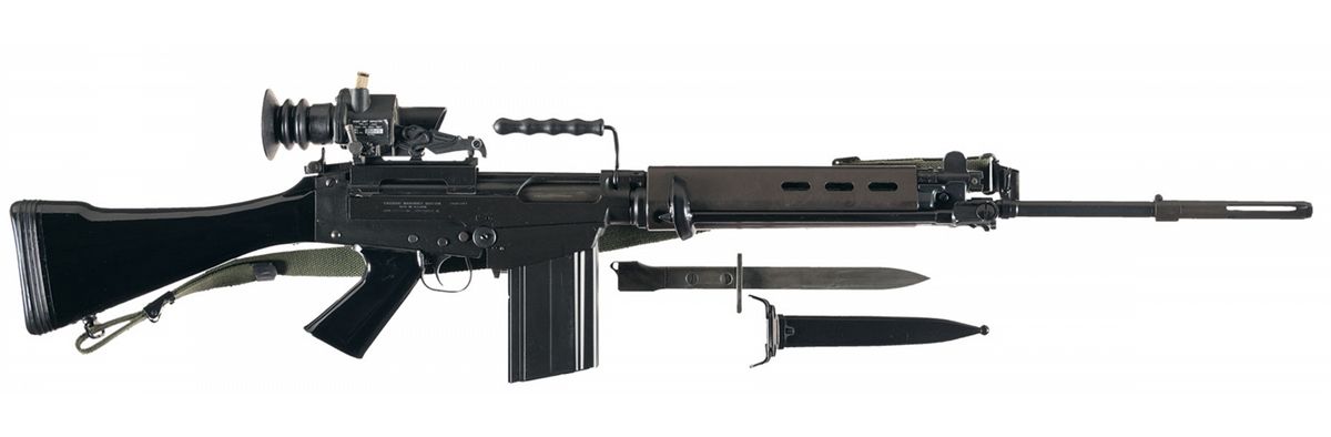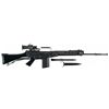 Made in Belgium and imported by Gun South. Adjustable front and military tangent peep sights. The right side of the receiver is marked "FABRIQUE NATIONALE HERSTAL/MADE IN BELGIUM/GUN SOUTH INC. TRUSSVILLE AL.". The left side of the receiver is marked ".308 MATCH". Adjustable gas port, a long flash hider, bi-pod, carrying handle, triangular composite forearm, black composite buttstock and black composite pistol grip. Equipped with a Trilux L2A2 illuminated scope. Complete with bayonet and scabbard.