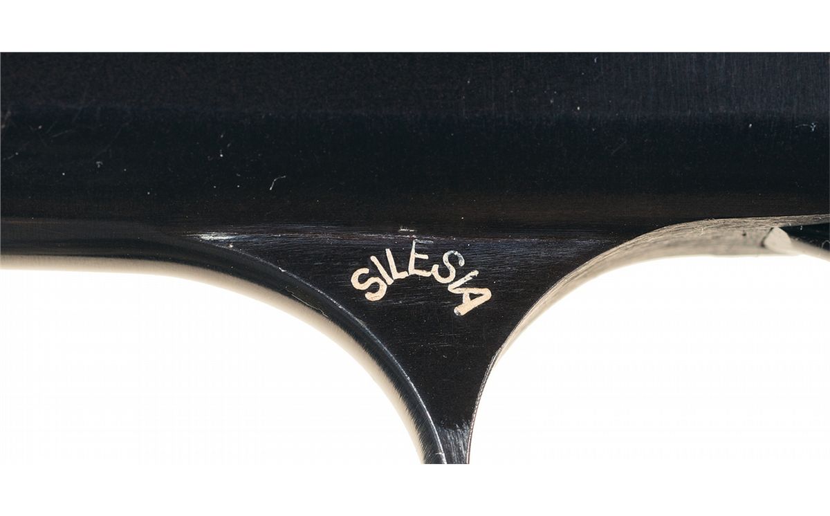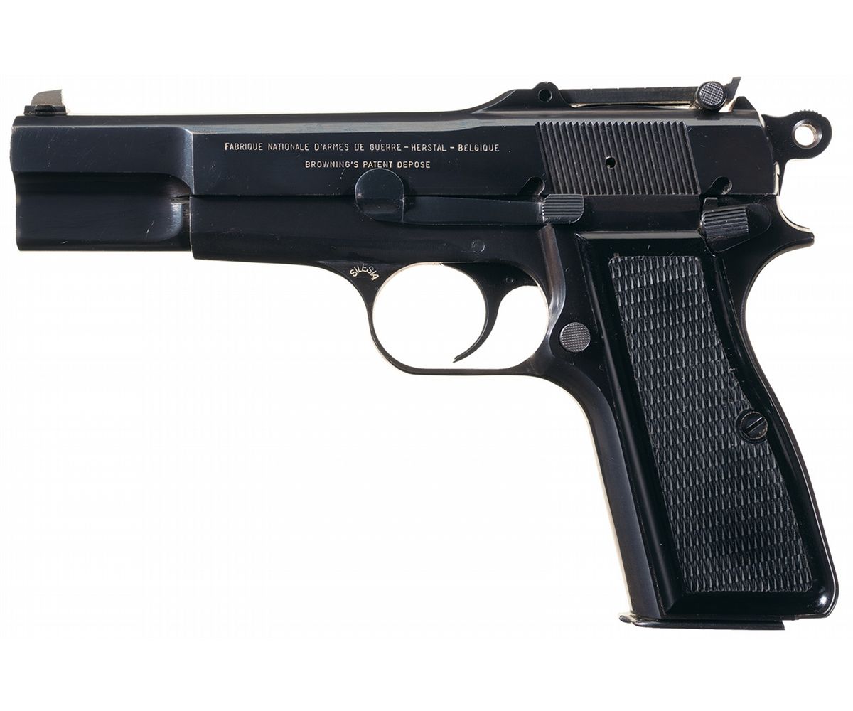 Very early post war contract pistol with the rare "SILESIA" marked trigger guard. It has fixed front and tangent rear sights, checkered plastic grips, and serrated round hammer. The left side of the slide has the two line FN commercial marking with Belgian proofs stamped on the frame and chamber. Matching stacked serial numbers on slide, frame and chamber. With Browning soft case.