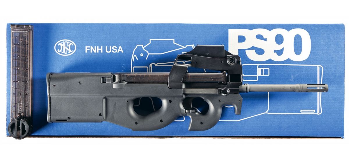 Introduced in 2005 as a semi-automatic, civilian legal carbine based off the P90 Personal Defense Weapon. Fitted with dual cocking handles, integral bird cage flash hider, ambidextrous disc safety and adjustable optical sight. Polymer thumbhole stock with 30-round top feed magazine. With factory box numbered to gun, extra magazine, cable lock and papers.