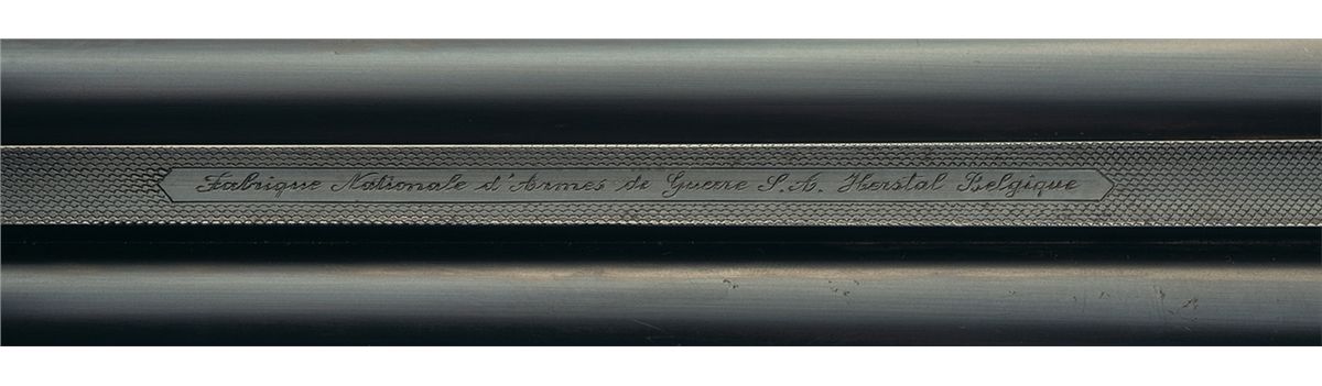 The receiver, side plates, trigger plate, trigger guard, forearm hardware and rear portion of the barrels have an engraved border pattern. The break lever has an intertwined "F/N" logo engraved on it. The top of the rib has a single brass bead sight and is engraved "Fabrique Nationale d'Armes de Guerre S.A. Herstal Belgique". The bottom of the barrel is stamped with the various proofmarks along with the date code "i". The barrels are choked .006/.022 and have 2 3/4 inch chambers with ejectors. Mounted on a straight grain walnut straight grip stock with multi-point checkering and a Pachmayr recoil pad. Length of pull is 15 inches.
