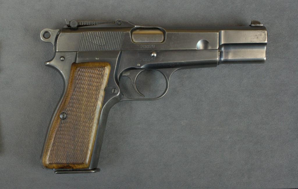 Fabrique Nationale pre-Nazi Hi Power semi-auto pistol, 9mm cal., 4-3/4” barrel, blue finish, checkered wood grips, #20029. This gun is in overall fine condition showing the majority of its original finish, verygood bore, action and markings, very good grips, tangent adjustable rear sight. A scarce early FN. Est.: $900-$1,800.