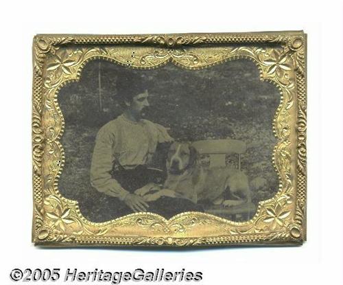 <B>Fabulous 1/4th Plate Ferrotype of a Man and His Dog</B></I> A great old outdoor photo of a mustached gentleman dressed in his finest checked shirt, suspenders and hat sitting in a chair next to his favorite hunting dog, whose paws are resting in his master's lap. Excellent and interesting tintype under glass in a period metal mat and frame. Lot:251