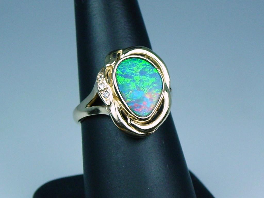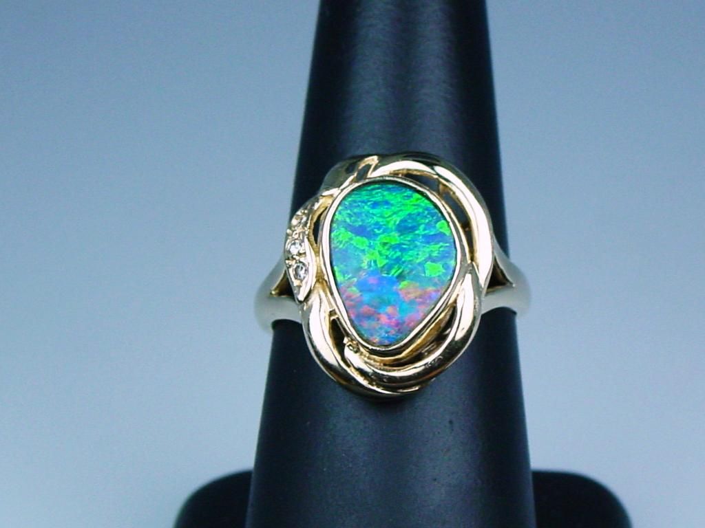 Fabulous 14 karat yellow gold ladies ring  bezel set with an Australian opal of fine  colors of blue and green weighing approx.  4.00 carats and side diamonds. Retail  $1,500-$2,000 Estimate $600-$900 Nice