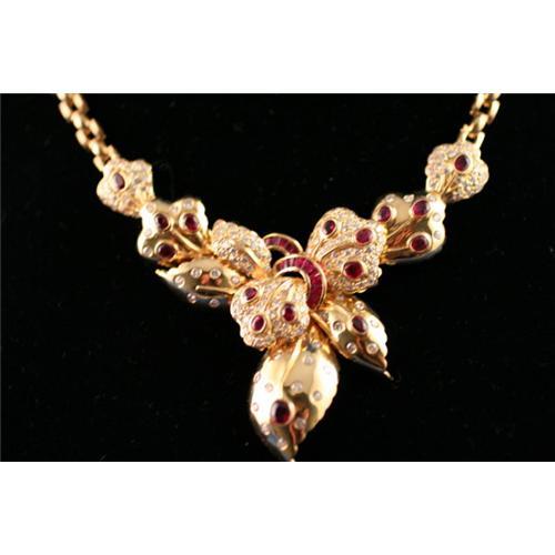 <table width="100%" border="0" cellspacing="0" cellpadding="4"><tr><td><em> Luxe, extravagant and beautiful!!</em></td></tr><tr> <td width="100%"> This is a luxe, extravagant piece- made of yellow 18K gold, it features over one carat of bright, white diamonds and approximately 7 carats of bright red ruby. The chain is a beautiful square flat link. The presentation measures 1 3/4 inches by 3 inches. The piece is 17 inches long. It weighs 24.1 grams. It has a beautifully working clasp and safety catch. </td></tr><tr> <td> </td></tr><tr> <td>Reference #: PT146</td></tr><tr><td>Condition:Excellent</td></tr><tr><td>Year:c1960-90</td></tr><tr><td>Title:Fabulous 18K Gold, Ruby and Diamond Estate</td></tr><tr><td>Style:Floral</td></tr><tr><td>Materials:18K Yellow Gold, Rubies, Diamonds</td></tr><tr><td>Type:Floral</td></tr><tr><td>Location:Minneapolis, Minnesota</td></tr></table>