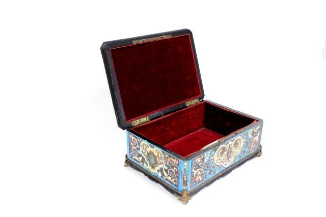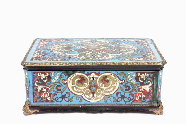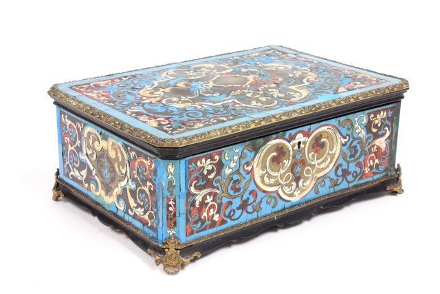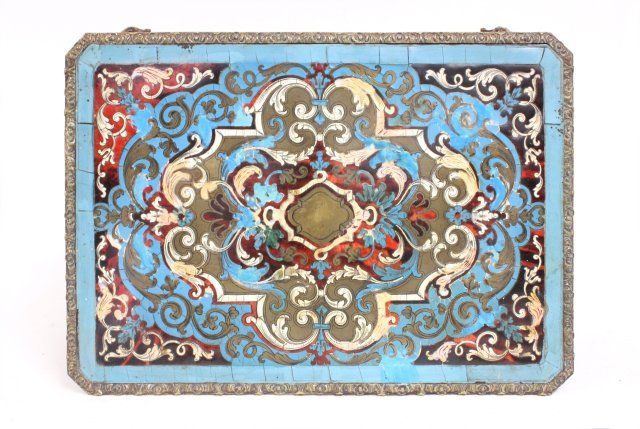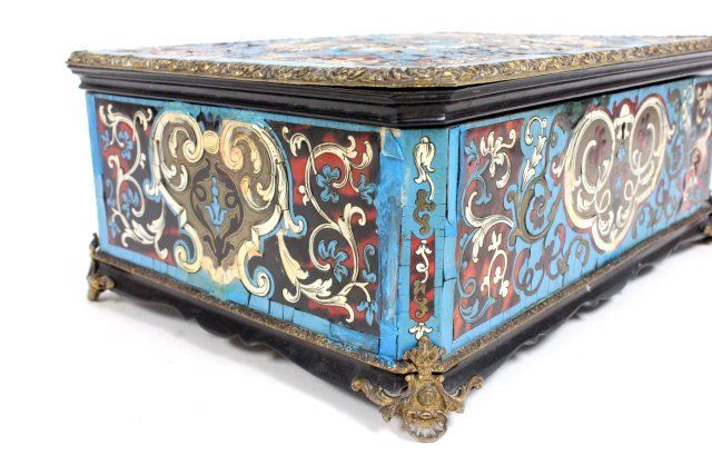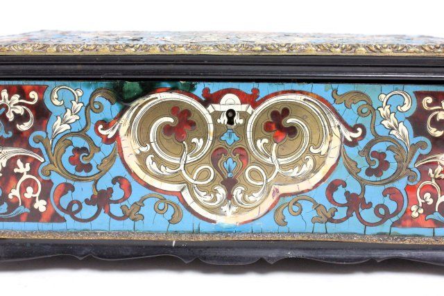 Bronze mounts, bone, brass & tortoise shell inlays. Has some repair. Approx. 12" x 8.75" x 5".