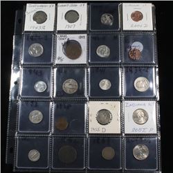 185 - Page of 20 Mixed coins Standing Liberty 25c, Braided Hair 1c, Washington 25c, Liberty 5c, Indian 1c,Key Date Coins Inc