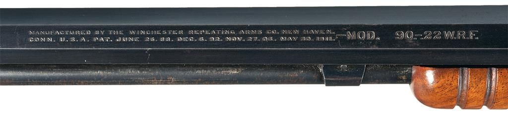 This is a beautiful example of a super rare Deluxe "Factory" engraved and highly embellished Winchester Model 90 slide action rifle. This rifle is super rare and probably one of the last if not the LAST Winchester model 90 manufactured by Winchester as the serial number of this rifle, (790502), falls well outside of the last noted serial numbered Model 90 (750,044) manufactured in late 1941 just prior to WWII. Consequently it is our opinion that this rifle was actually a very special order/presentation rifle manufactured/assembled by Winchester in the late 1940s using left over parts and assemblies from earlier production. To help reinforce this theory this rifle has several very unique features, such as the superb factory No. 8 Deluxe engraving pattern along with the fabulous "deluxe/fancy" grade English walnut pistol grip stock with checkering on the side of the grip area and a small and totally unheard of right hand cheekpiece! The stock is also fitted with the standard Winchester hard rubber grip cap and crescent buttplate, and a standard 12 groove pump handle also made of English walnut that shows a slight amount of figure on the sides. The underside of the buttstock has a small identification disc inset into the wood with the initials "F.B.U." engraved on it. Obviously someone of super importance! The engraving pattern on this rifle is shown on page 308 of the book "Winchester Engraving" by R.L. Wilson, and features a beautiful, oval engraved pattern on each side of the receiver, with the left side depicting two squirrels chasing each through the trees, while the right sides shows a group of rabbits in a wooded country scene. Both panels are flanked by beautiful large Ulrich style "S" scroll engraving inside several blocks that border the outer edges of the receiver. These blocks of engraving are intermixed with a zig-zag/wavy pattern towards the rear of the receiver. There is also a small amount of engraving on the top of the receiver ring, the front edge of the upper tang, behind the hammer, the heel of the buttplate and front edge of the lower tang. This number 8 engraving was very popular and used primarily on small frame rifles by many of the master engravers in the late 1900s up through the 1940s. Although this is a typical John Ulrich pattern he had stopped engraving for the Winchester factory well before this time, with this work probably attributed to his son George Ulrich who was active at the Winchester factory from the 1920s until his death in 1949. This rifle is a late 3rd model with takedown mechanism, which features a locking cut made on the front top of the receiver to allow the breech bolt to lock externally. It is fitted with an original barrel that has the late pattern Winchester, two-line address and patent dates, followed by "--MOD. 90---" and the caliber markings; "22W.R.F.", all offset on the left barrel flat. The barrel is fitted with the special order 3/4 length tubular magazine tube. The barrel is fitted with the standard Winchester bead front sight with the Model 90 adjustable rear sight. The rifle has also been equipped with a special order late production Lyman number 2A combination tang rear sight with the short staff, large Merit eyecup with the locking feature on the left side. The top of the sight base is marked: "LYMAN/Middlefield/ CONN. U.S.A.". The barrel and receiver both carry the proper Winchester "WP" proof marks.
