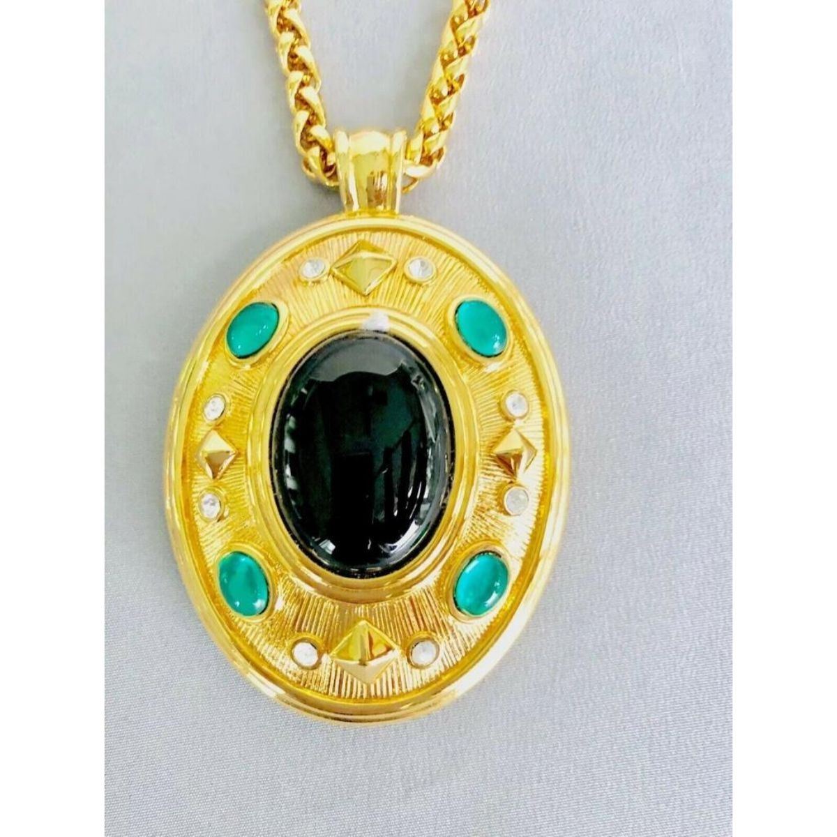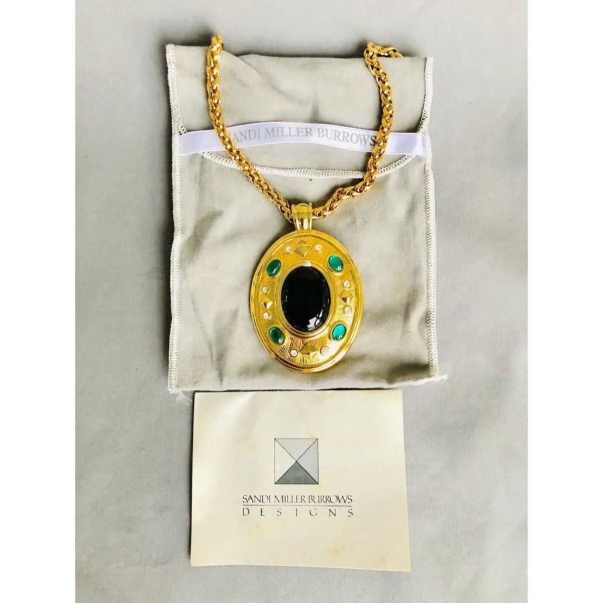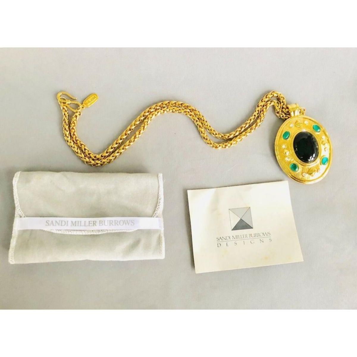 Fabulous Designer Sandi Miller Burrows, gold-tone photo locket pendant necklace with emerald green stones & clear crystals. Burrows has been a designer for the famous fashion houses; Yves Saint Laurent, Valentino & Ralph Lauren. This is a large & elegant statement piece. 3" ( with bale ) X 2" locket on 28" L chain ( 5mm thick ). Comes with original pouch & booklet. Metal tag attached to chain stamped with signature X followed by SMB. Very little signs of wear. 6 oz weight.Â