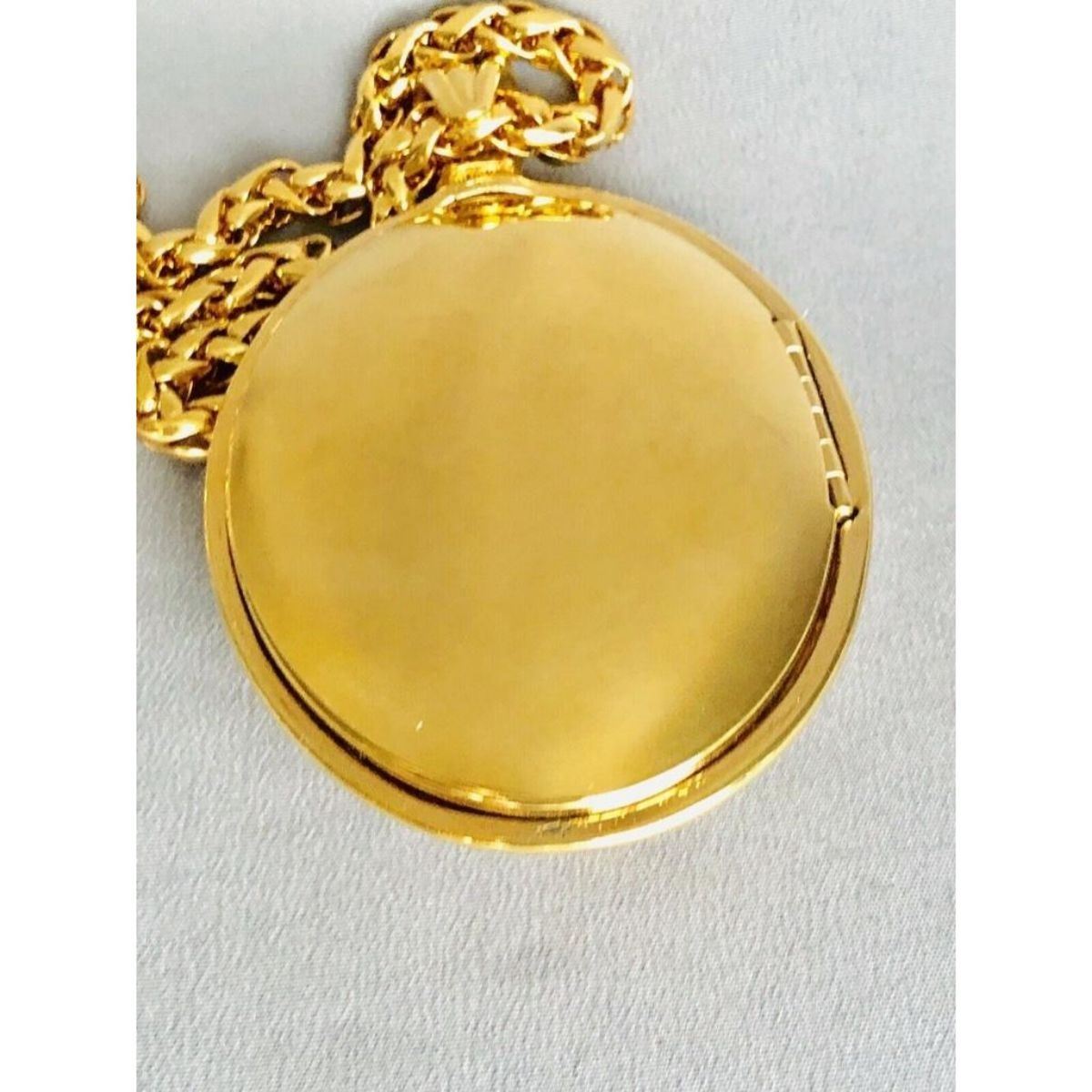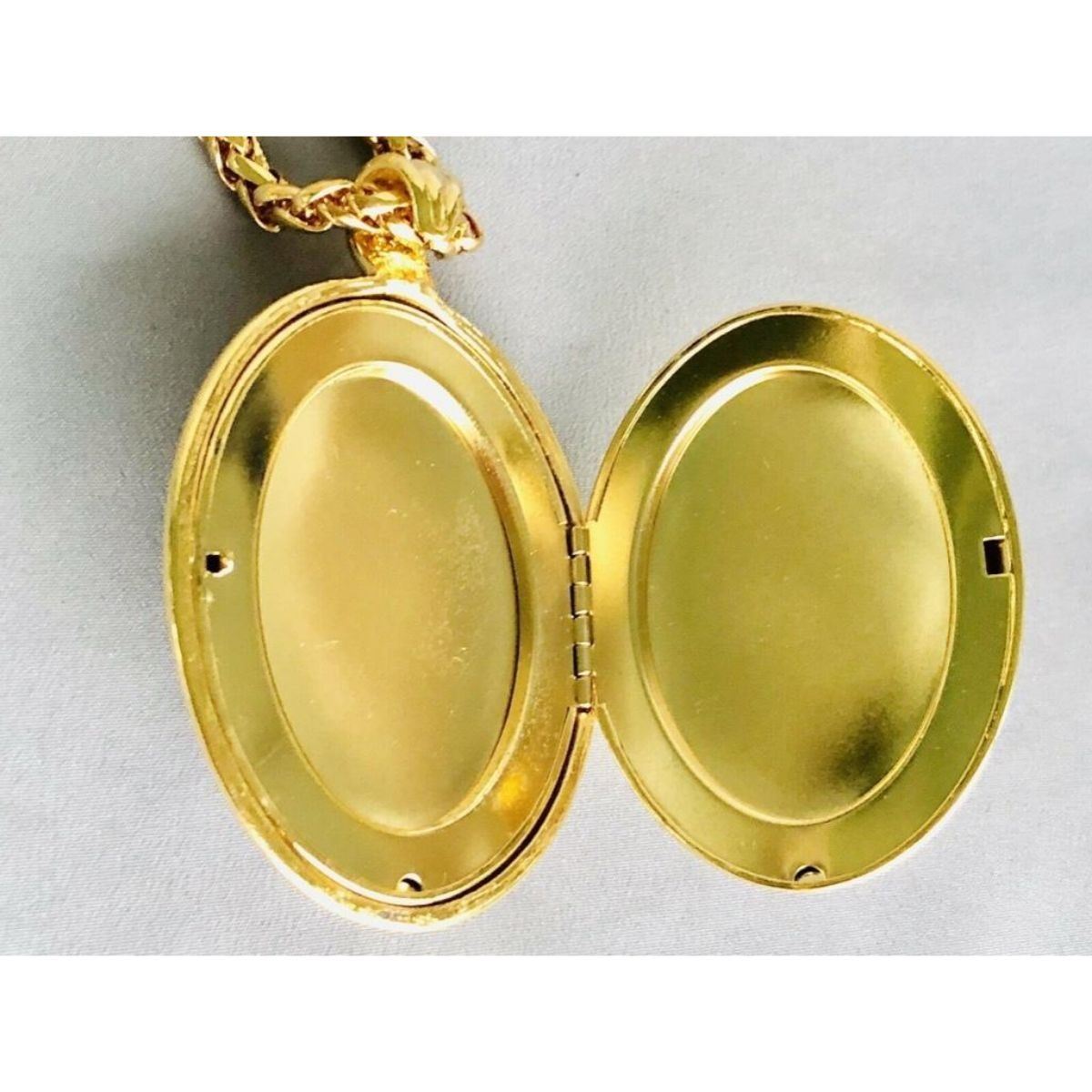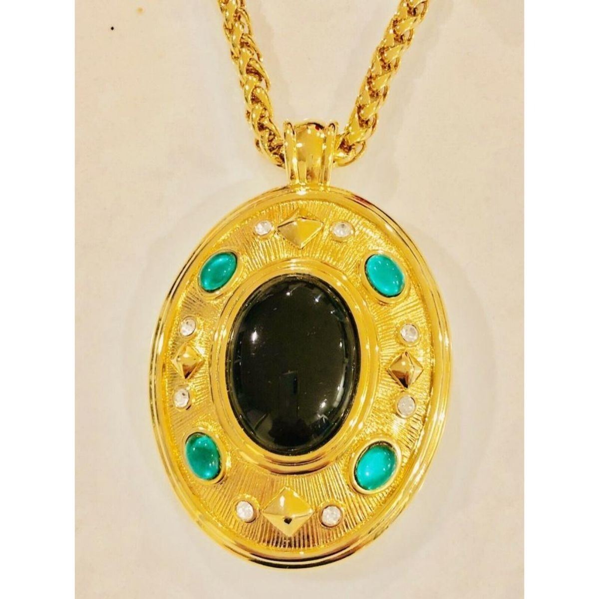 Fabulous Designer Sandi Miller Burrows, gold-tone photo locket pendant necklace with emerald green stones & clear crystals. Burrows has been a designer for the famous fashion houses; Yves Saint Laurent, Valentino & Ralph Lauren. This is a large & elegant statement piece. 3" ( with bale ) X 2" locket on 28" L chain ( 5mm thick ). Comes with original pouch & booklet. Metal tag attached to chain stamped with signature X followed by SMB. Very little signs of wear. 6 oz weight.Â