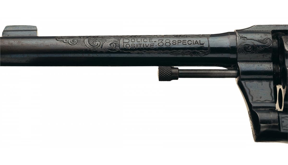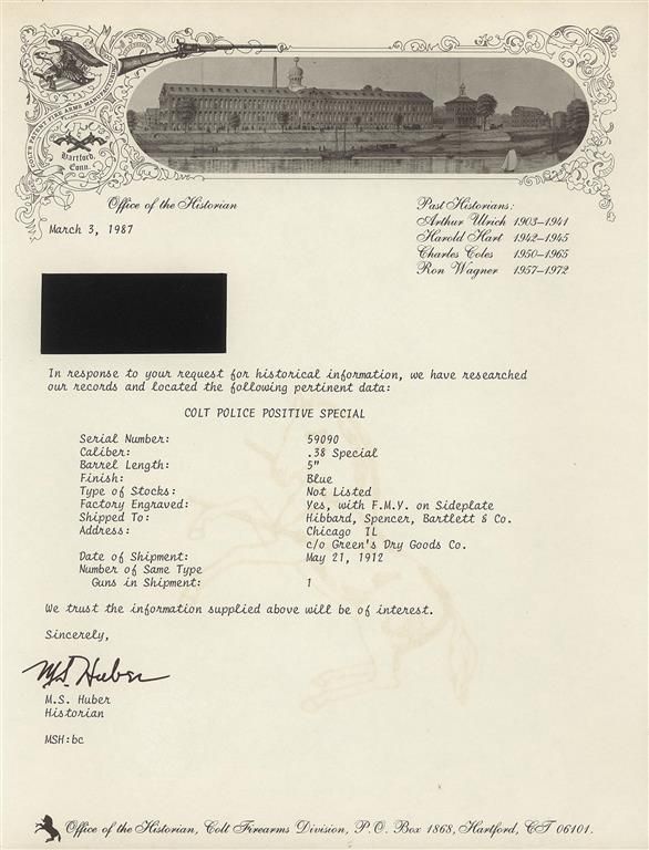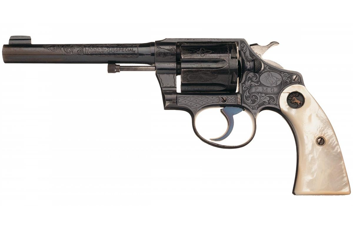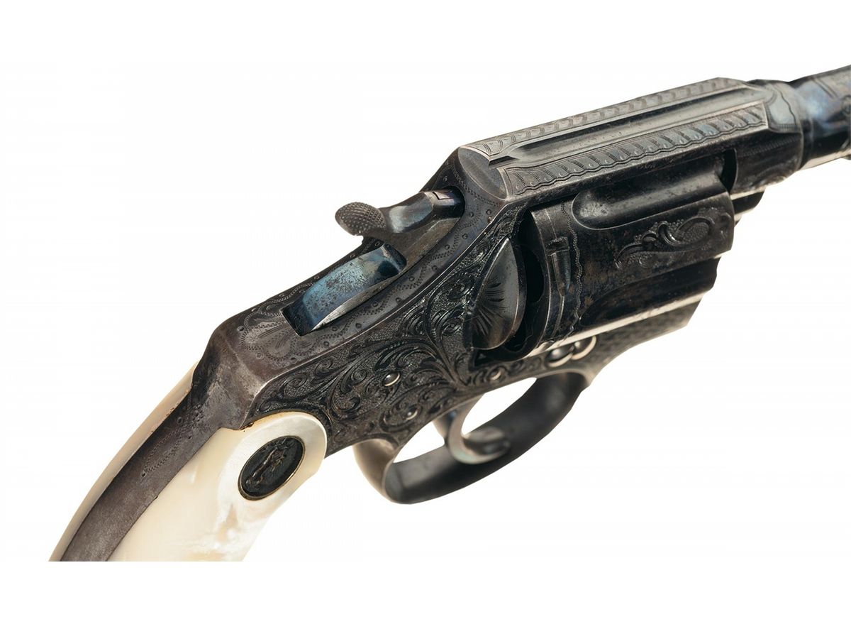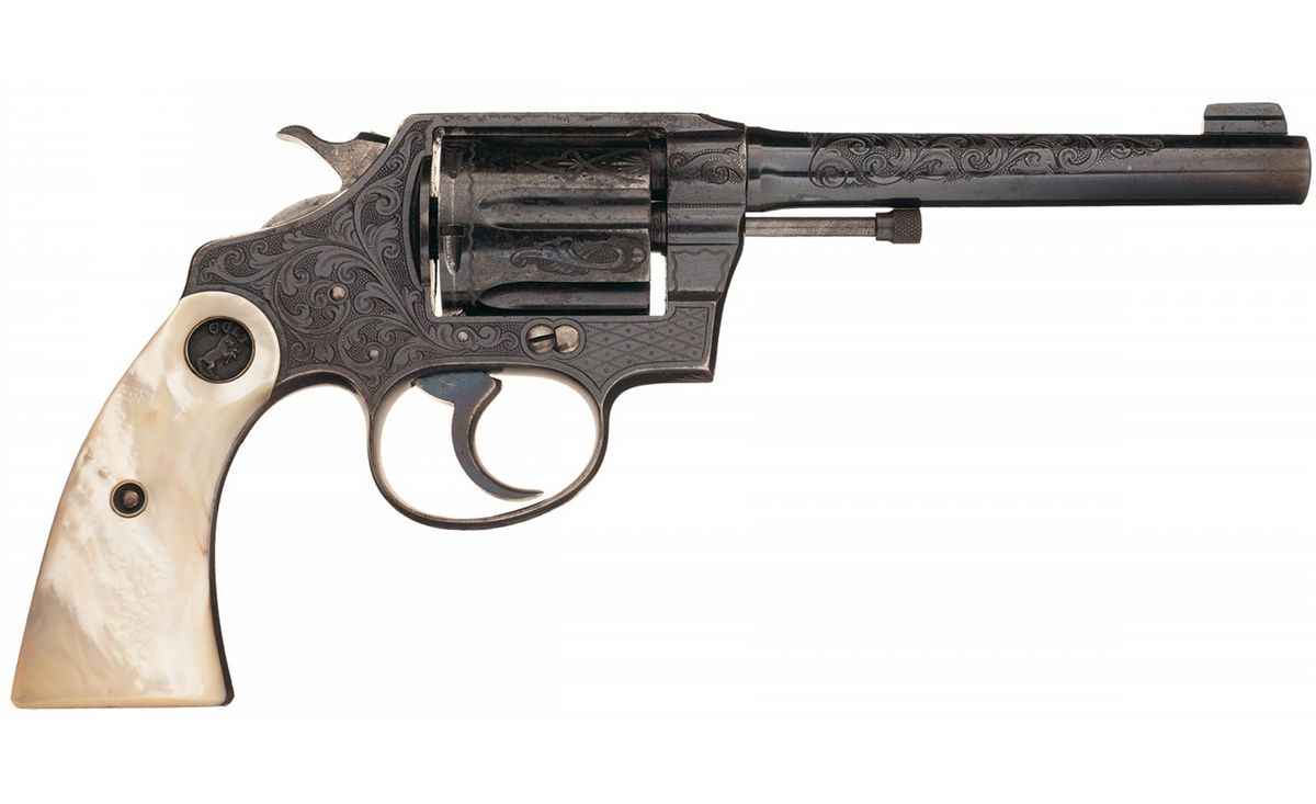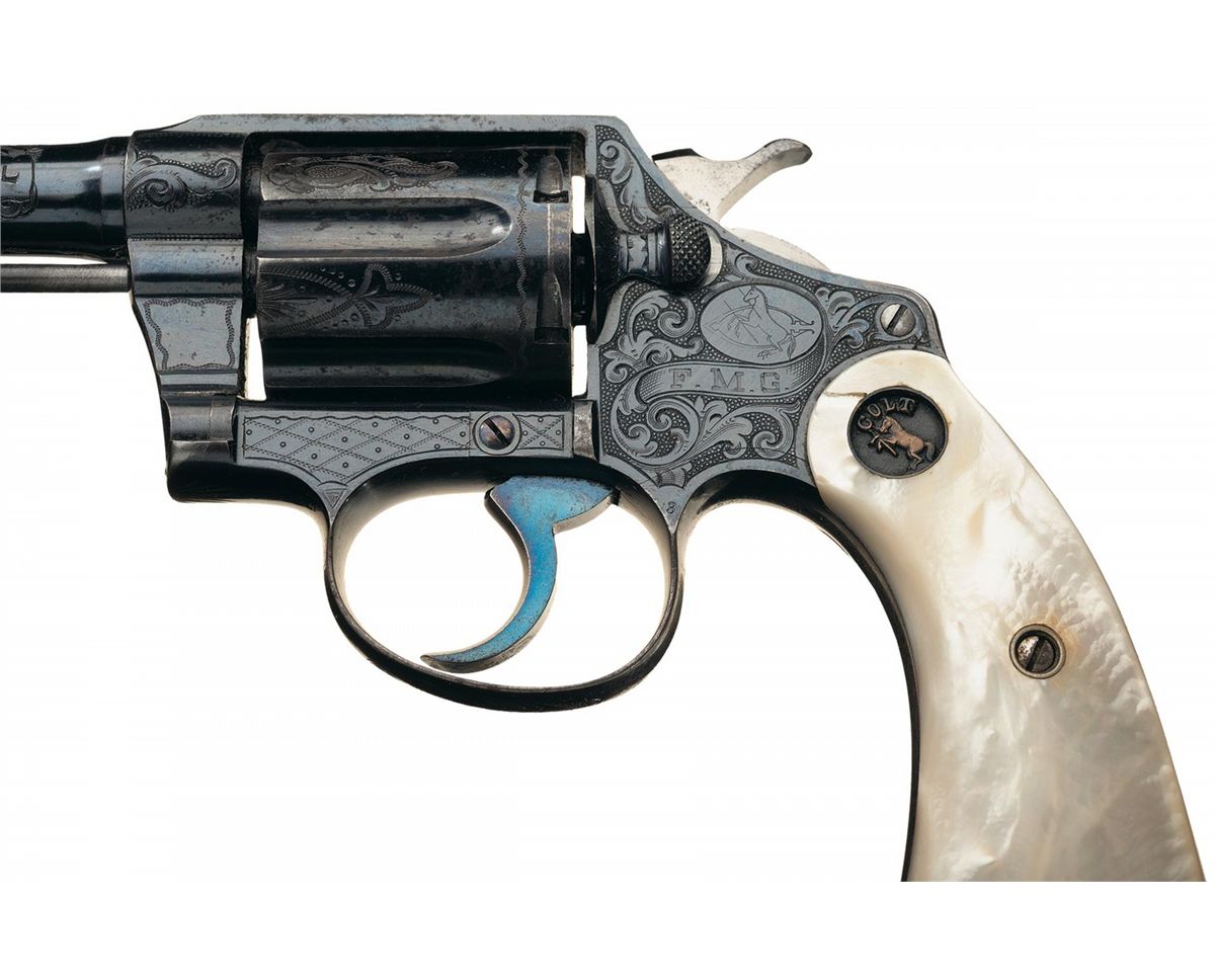This is a beautiful all original Colt Police Positive Double Action Revolver that is documented as being factory engraved. This exceptional revolver was engraved in a "B+" coverage (50 percent coverage) on the metal surfaces, in the ever popular and highly desirable Cuno Helfricht pattern. It's fitted with a rare set of smooth mother of pearl grips. This exceptional revolver is accompanied by a Colt factory letter that verifies this pistol as being factory engraved with a engraved monogram initials on the side plate and shipped as a "1" gun shipment to Hibbard, Spencer, Bartlett & Co.of Chicago Ill. The revolver was manufactured in early 1912. As noted it has a beautiful Cuno Helfricht pattern engraving with large scrolls, heavy punch dot back ground intertwined and his classic style of zig-zag geometric engraving patterns on the chambers of the cylinder, the side plate, top strap and flats of the frame. A circular pattern has been engraved around the "Rampant Colt/C" on the left side plate which ends with a small engraved banner under the Colt logo. Inside the banner it has been prominently engraved with the initials "F.M.G." (mistakenly listed as F.M.Y. on the factory letter). The actual individual has not been identified but would be worth further investigation. The engraving on this revolver is impeccable. The layout and detail is absolutely flawless and was probably done by the Master Engraver himself or certainly in his shop by a senior engraver as it is beautiful. The pistol has been fitted with a set of beautiful mother of pearl grips that have the gold Colt medallions on the top of each grip. The grips have been correctly factory numbered in ink on the back sides. Also accompanying this wonderful revolver is an equally rare early unmarked 1910-20s era hand carved leather holster. It has a full length wide skirt on the back side of the holster and the face of the holster has been hand carved with a large floral scene that has been decorated with a rough texture pattern back ground. The edge of the holster has the old original style hand laced leather strap stitching commonly used in the Mexican style double and single loop holster. The back and inside of the holster is covered in a soft elk/cow skin lining and has a single strap to hold the revolver inside the holster.
