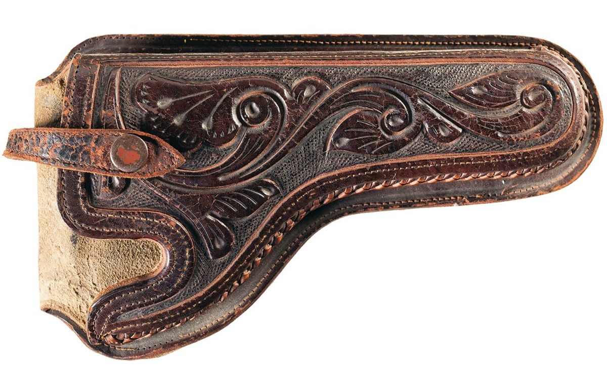 Very fine with 80% of the original high polish blue finish overall with a light patina on the grip straps with minor blue flaking and thinning on the sides of the cylinder and front area of the barrel. The front sight has been filed down slightly. The factory medallion pearl grips are very fine showing great color with a few barely noticeable chips on the edges in a couple of places, which is rare as they are very delicate. The engraving is excellent with nice sharp features and detail. Mechanically excellent. The holster is very fine with beautiful hand carving on the face with nice tight stitching on the sides. The lining on the back and inside the holster shows some minor dirt and oil stains from use but is fully intact. A beautiful very early Cuno Helfricht Colt factory engraved revolver rig.
