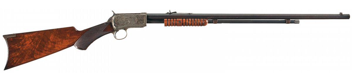 This is a beautiful example of an extremely rare deluxe factory engraved and highly embellished early Second Model Winchester Model 1890 slide action rifle, manufactured in late 1894. This is a beautiful Second Model that has the new takedown feature, but still retains the earlier concealed locking lugs of the First Model. These Second Models were produced for only a very short time between serial numbers 15,522 and 32,616 with this rifle being a late production model. This beautiful rifle has a very desirable factory "No. 8" engraving pattern that depicts a very rarely seen standing buffalo scene on one side, and a standing deer scene on the obverse. These engraving patterns were almost exclusively used on large frame lever action rifles such as the models 1886, 1892 and 1894 rifles. This pattern is shown on page 218 and 221 of "The Book of Winchester Engraving" by R.L. Wilson. The engraved scene itself is a semi-circular clamshell shaped panel with the standing buffalo in a prairie scene. The obverse depicts the same style of clamshell shaped panel with the standing deer in a slightly wooded scene. Both panels are flanked by beautiful medium sized tight scroll engraving that has a fine line border around the scroll engraving with heart-shaped designs as the border around the edges of receiver. The lower sides of the receiver also depict a wavy line pattern with single punch dot accents. The engraving was also applied on the top and front edge of the receiver, with a fine-line border around the edges of the stock and action group, and also that frames the upper tang factory markings and serial number. Although the engraving is not signed the beautiful detail could certainly be the work of John Ulrich, a Master Engraver of Winchester rifles or certainly someone in his shop. The side of the lower tang is stamped with factory work order number "3681" and "XXX" signifying the grade of wood. The rifle has been fitted with a beautiful extra fancy grade burl walnut pistol grip stock. The stock itself has an original Winchester hard rubber grip cap with a very fine line checkered pattern on each side of the pistol grip. It is also fitted with a standard 12 groove walnut pump handle that has just a hint of figure at the very front. The octagon barrel has the early Winchester markings "------MANUFACTURED BY THE -----/-----WINCHESTER REPEATING ARMS CO. NEW HAVEN CONN. U.S.A.-----". The rear of the barrel has the caliber markings of "22 LONG", which is very rare in itself as before 1919 this chambering was only used on a very limited basis. The barrel is fitted with the special order 3/4 length tubular magazine tube and it has the standard adjustable (slightly longer version) sporting rear sight and model 21 front sight. This beautiful rifle has the Winchester rust blue finish on the barrel and magazine tube with the receiver, trigger guard/lower tang/ hammer and buttplate all being casehardened finish.