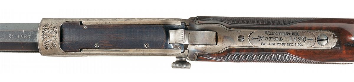 Fabulous Early Deluxe Factory Engraved Winchester Model 1890 Slide Action Rifle with Casehardened Receiver and Deluxe Walnut Stock