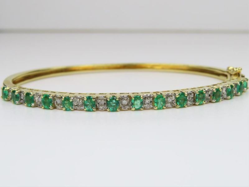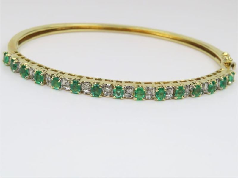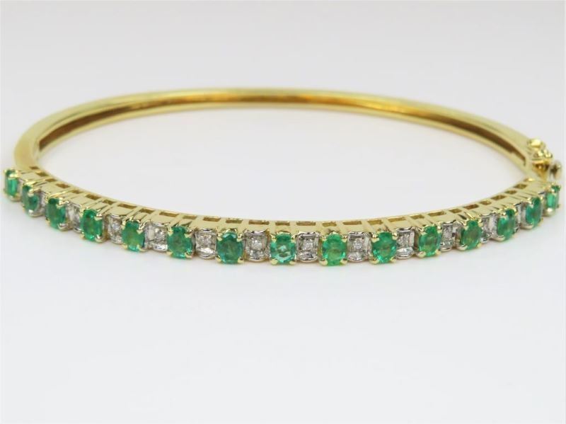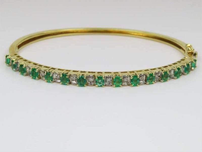 15 natural oval cut Emeralds weighing approx. 3.50-4.00 carats total accented with 14 round cut Diamonds set in a 14 karat yellow gold hinged style bangle bracelet.