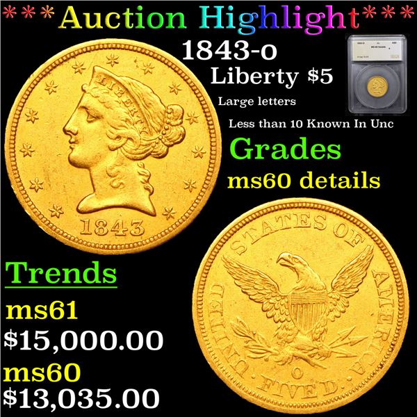 ***Auction Highlight*** 1843-o Gold Liberty Half Eagle $5 Graded ms60 details By SEGS (fc)
