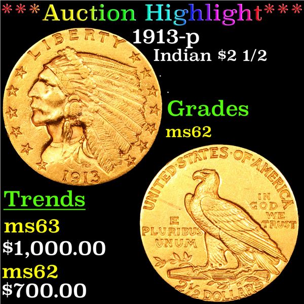 ***Auction Highlight*** 1913-p Gold Indian Quarter Eagle $2 1/2 Grades Select Unc.