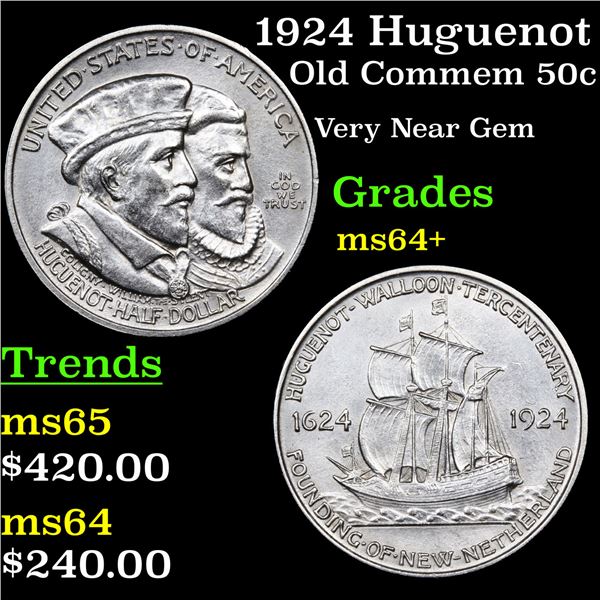 1924 Huguenot Old Commem Half Dollar 50c Grades Choice+ Unc.