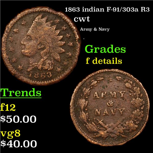 1863 indian F-91/303a R3 Civil War Token 1c Grades f details. Obverse-Turban Liberty Reverse-Army & Navy