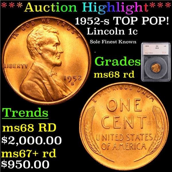 ***Auction Highlight*** 1952-s TOP POP! Lincoln Cent 1c Graded ms68 rd By SEGS. Up for Auction is a stunning TOP POP sole Finest Known Lincoln