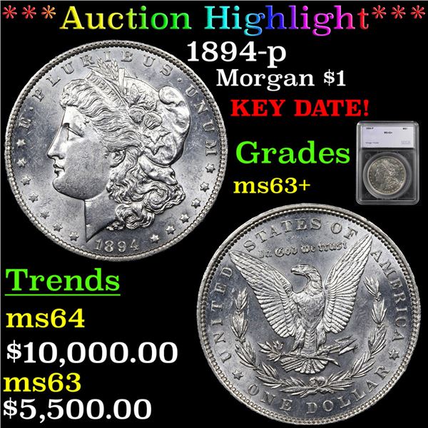 ***Auction Highlight*** 1894-p Morgan Dollar $1 Graded ms63+ By SEGS. A beautiful untoned silver-grey example with mint luster that is universa