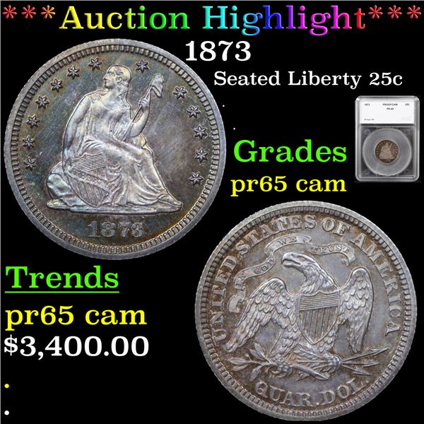 ***Auction Highlight*** 1873 Seated Liberty Quarter 25c Graded pr65 cam By SEGS. A Corey's Pick, Bid to Win Coin