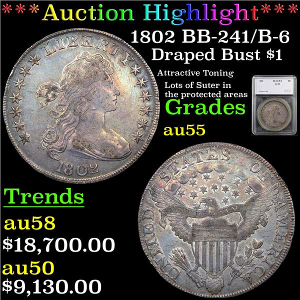 ***Auction Highlight*** 1802 BB-241/B-6 Draped Bust Dollar $1 Graded au55 By SEGS (fc)412 - ***Auction Highlight*** 1802 BB-241/B-6 Draped Bust Dollar $1 Graded au55 By SEGS (fc)