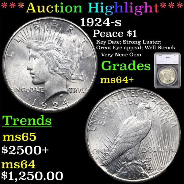 ***Auction Highlight*** 1924-s Peace Dollar $1 Graded ms64+ By SEGS. A Corey's Pick, Bid to Win, Don't let it get Away Coin