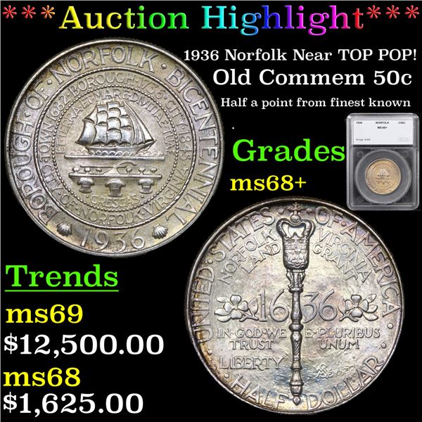 ***Auction Highlight*** 1936 Norfolk Near TOP POP! Old Commem Half Dollar 50c Graded ms68+ By SEGS.