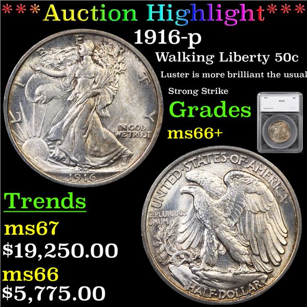 ***Auction Highlight*** 1916-p Walking Liberty Half Dollar 50c Graded ms66+ By SEGS (fc)426 - ***Auction Highlight*** 1916-p Walking Liberty Half Dollar 50c Graded ms66+ By SEGS (fc)