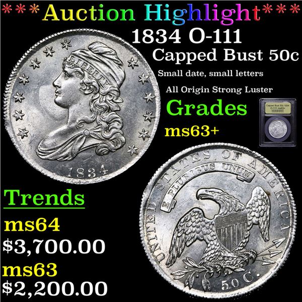 ***Auction Highlight*** 1834 O-111 Capped Bust Half Dollar 50c Graded Select+ Unc BY USCG.
