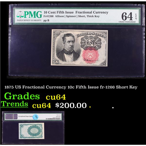 1875 US Fractional Currency 10c Fifth Issue fr-1266 Short Key Graded cu64 By PMG. 0