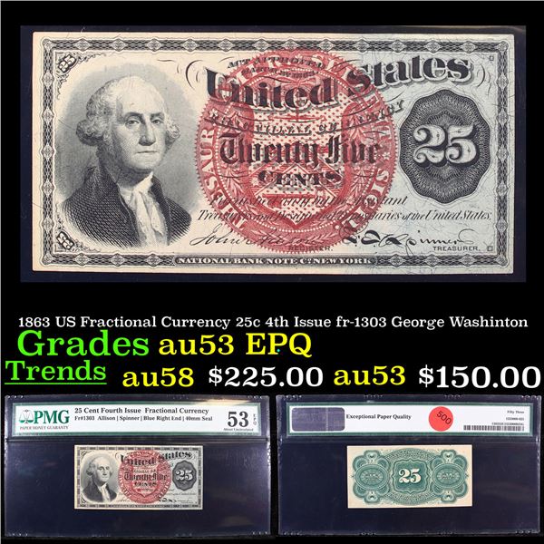 1862 US Fractional Currency 25¢ First Issue Fr-1281 Thomas Jefferson W/ Monigram Graded au58 By PMG