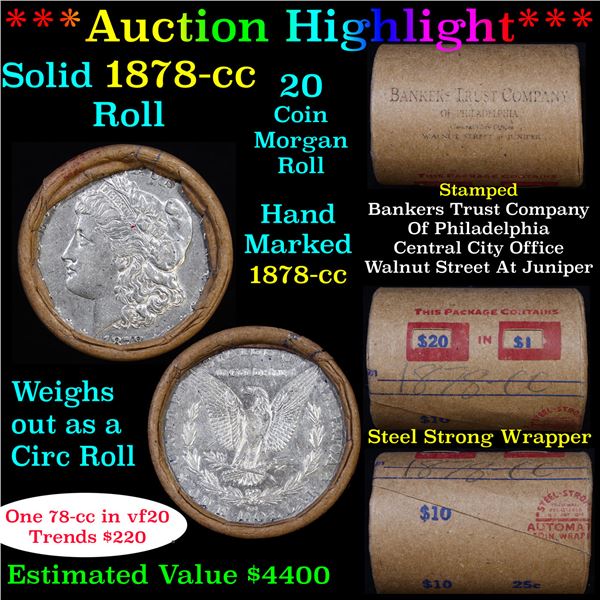 ***Auction Highlight*** Full solid date 1923-p Uncirculated Peace silver dollar roll, 20 coins. This roll is held in an old Steel strong wrappe