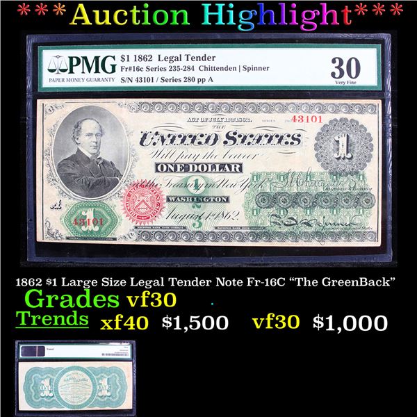 ***Auction Highlight*** 1862 $1 Large Size Legal Tender Note Fr-16C "The GreenBack" Graded vf30 By PMG. Series 1862 Legal Tender bi...